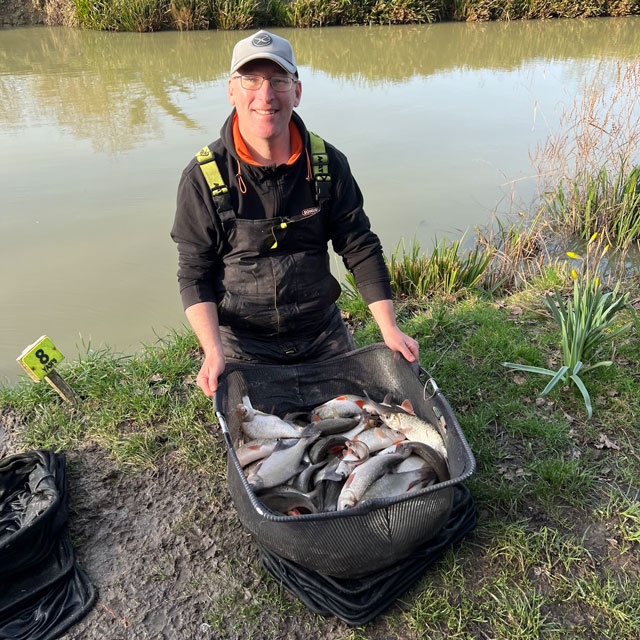 I had an amazing first couple of hours and then the sun’s come out and it’s got progressively harder with a biteless last 10 minutes, but I’d done more than enough and had a brilliant day’s sport. An hour to go I really wasn’t sure what I’d got, so I popped back for a second fishery keepnet, just in case. That turned out to be a wise move as it’s a 50lb net limit and I totalled 51lb 5oz for the win! Mostly ide, but some nice skimmers, one big roach, one tench and two crucians. All on maggots and pinkies, using similar tactics to my recent film at the venue.