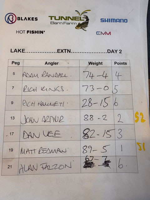 Day 2 I’m back on a familiar peg 13 on Extension. Definitely not top of your choices in that section, but it has its moments. Thankfully I’ve had a great start down the side on pellets, but lost a couple that have charged through snags. Thought I’d catch across pinging maggots, but that was surprisingly poor. The rest of the match I’ve just fished up and down, short and down each side on maggots. My 88lb was 2nd in section. Agonisingly just 1lb adrift of Matt Redman who had 89lb off peg 19.