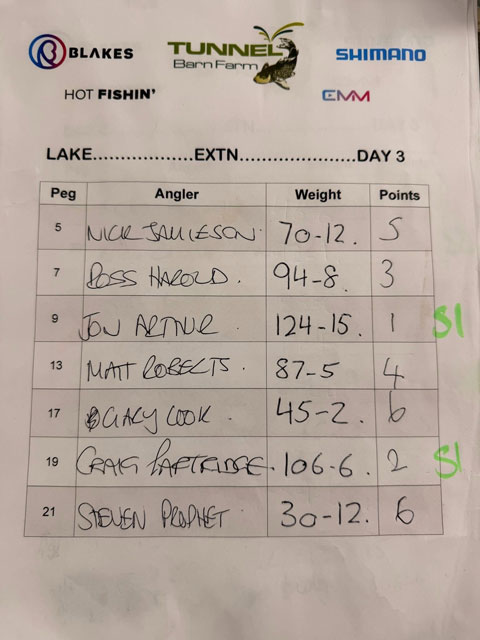 Day 3 I’m in the same section on Extension, but this time on peg 9. Happier with that, but you’ve still got 5, 7, 19 and 21 to contend with, which are all strong pegs. Slow start down the side on pellets and felt the fish were being moody after several days hammer. Eventually lined up a few shallow to the pots, but the wind was getting ridiculous. Had a few down the side and the last two hours I’ve caught really well short on maggots. My 124lb was enough to win the lake for a nice end to the festival.